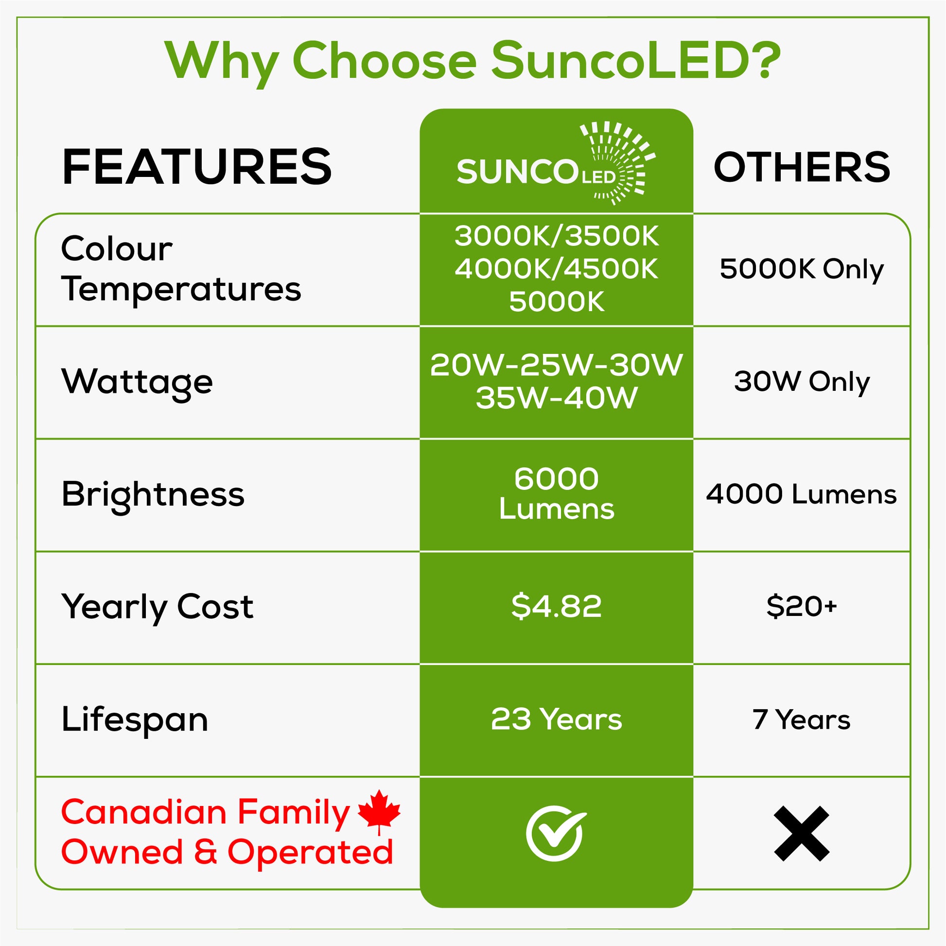 - 5-YEAR WARRANTY: Customer service and offering top-quality products are our first and foremost priorities at SuncoLED. We guarantee that you are gonna love our product. SuncoLED offers a 5-year warranty to cover most damage and defects in the product. 24-hour customer service is here to help against any issues. We are UL and cUL-Certified