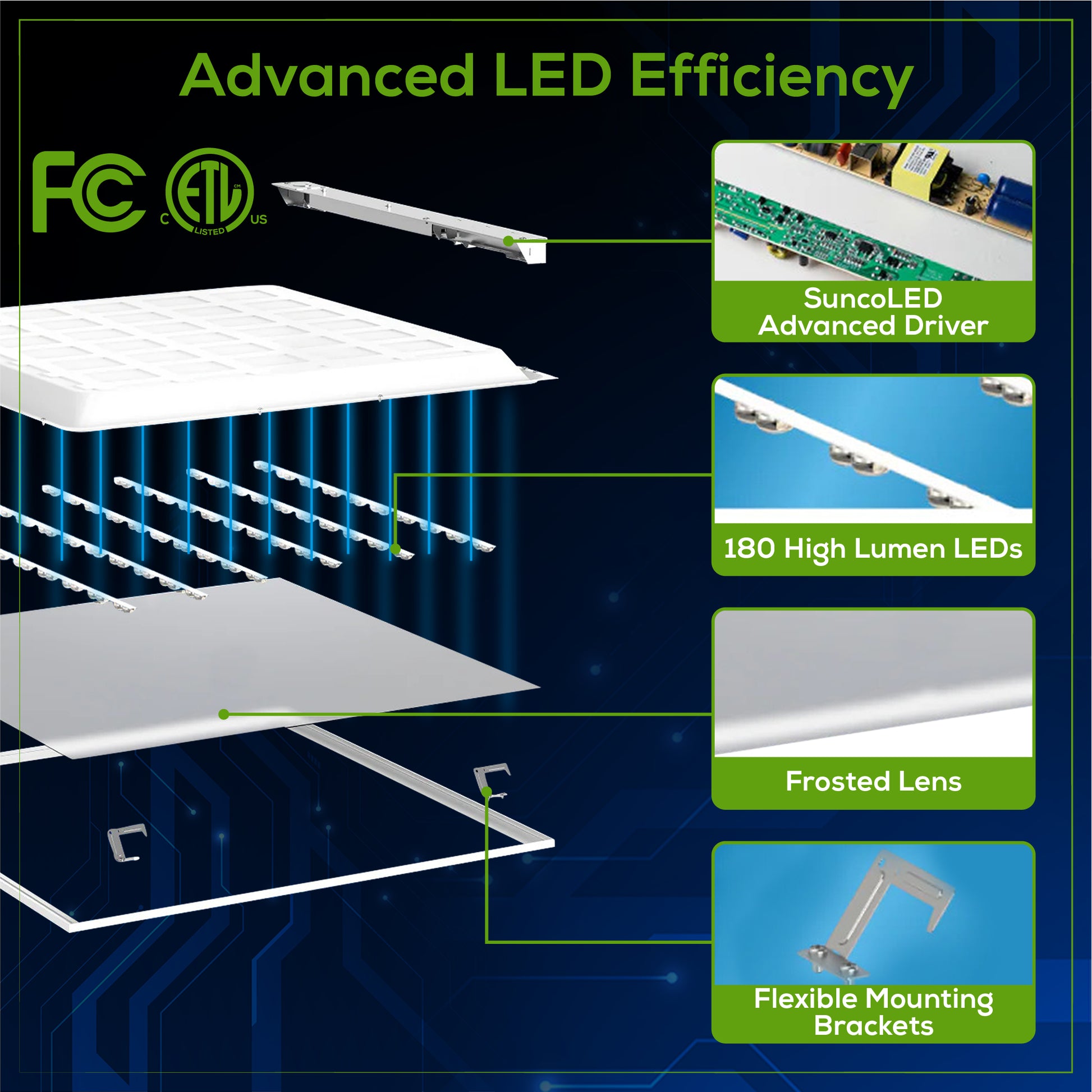 - ENERGY EFFICIENT: SuncoLED Back- lit LED flat panel light is a great alternative to a 3-Lamp F17T8 tube fixture. Save up to 80% on your next electricity bill. Eliminates noise, bulb replacement and conserves energy. Power Consumption is 40W.